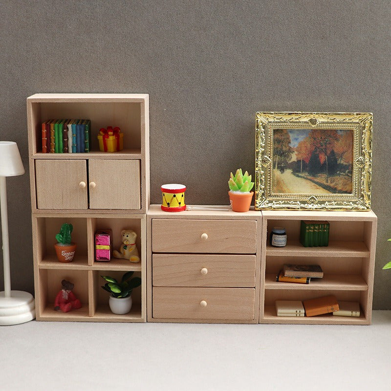 Miniature Wooden Cabinet DIY Miniature Wooden Cabinet - 1:12 Scale Dollhouse Diorama with Drawers & Open Shelves | Realistic Storage Furniture, Khaki Doll Accessories for Room Decor