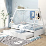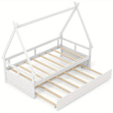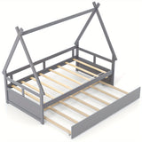 Charming Twin House Bed with Trundle - Sturdy Wooden Frame, Safety Guardrail & Roof - Perfect for Youngsters' Room Decor, No Box Spring Needed, Grey\u002FWhite