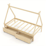 COSTWAY Kids House Bed with 2 Storage Drawers, Classic Style Wooden Tent Bed Frame, Sturdy Hardwood & Metal Construction, No Box Spring Required, with Roof for Boys & Girls, Age 12 & Under