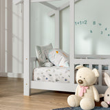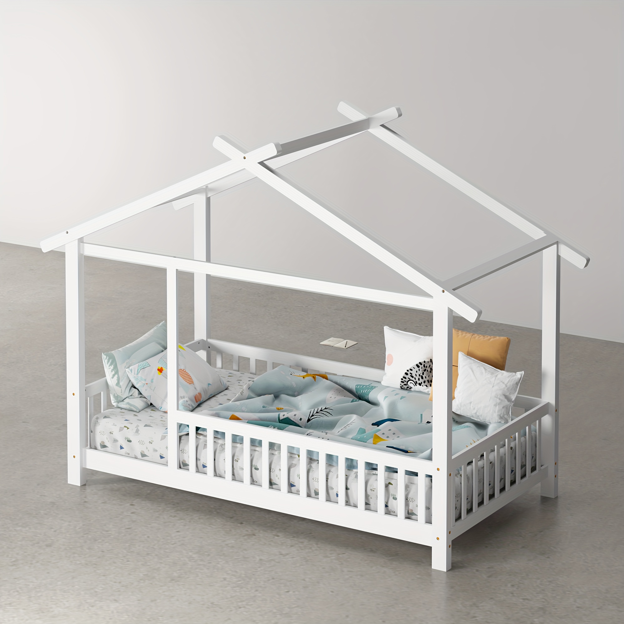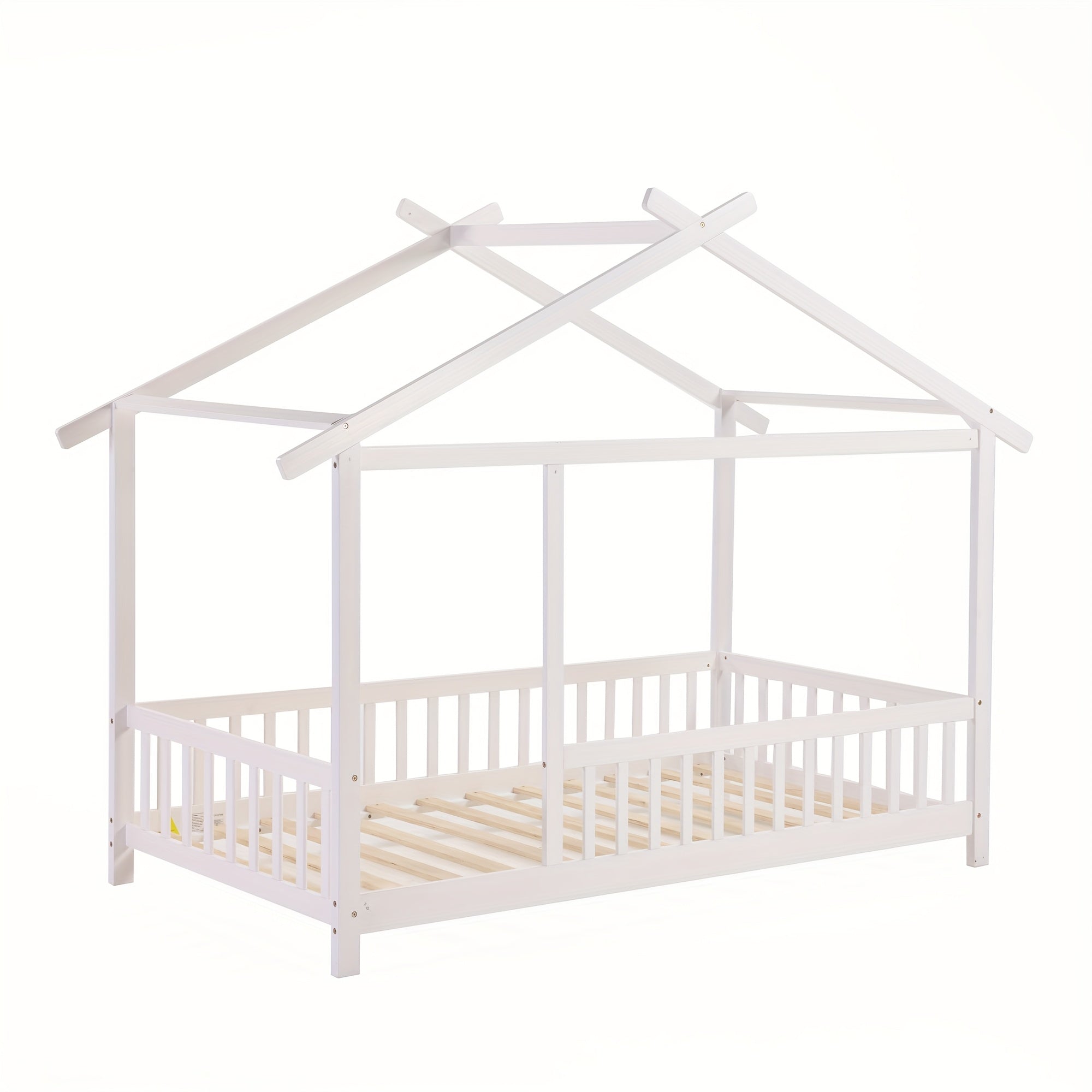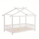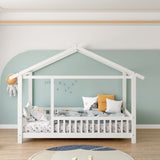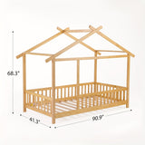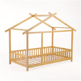 SOGES Wood Montessori House Bed Frame – Low Floor Bed With Fence & Guardrails, Bed Frame With House Roof Canopy, Decoratable Playhouse Bed, No Box Spring Needed