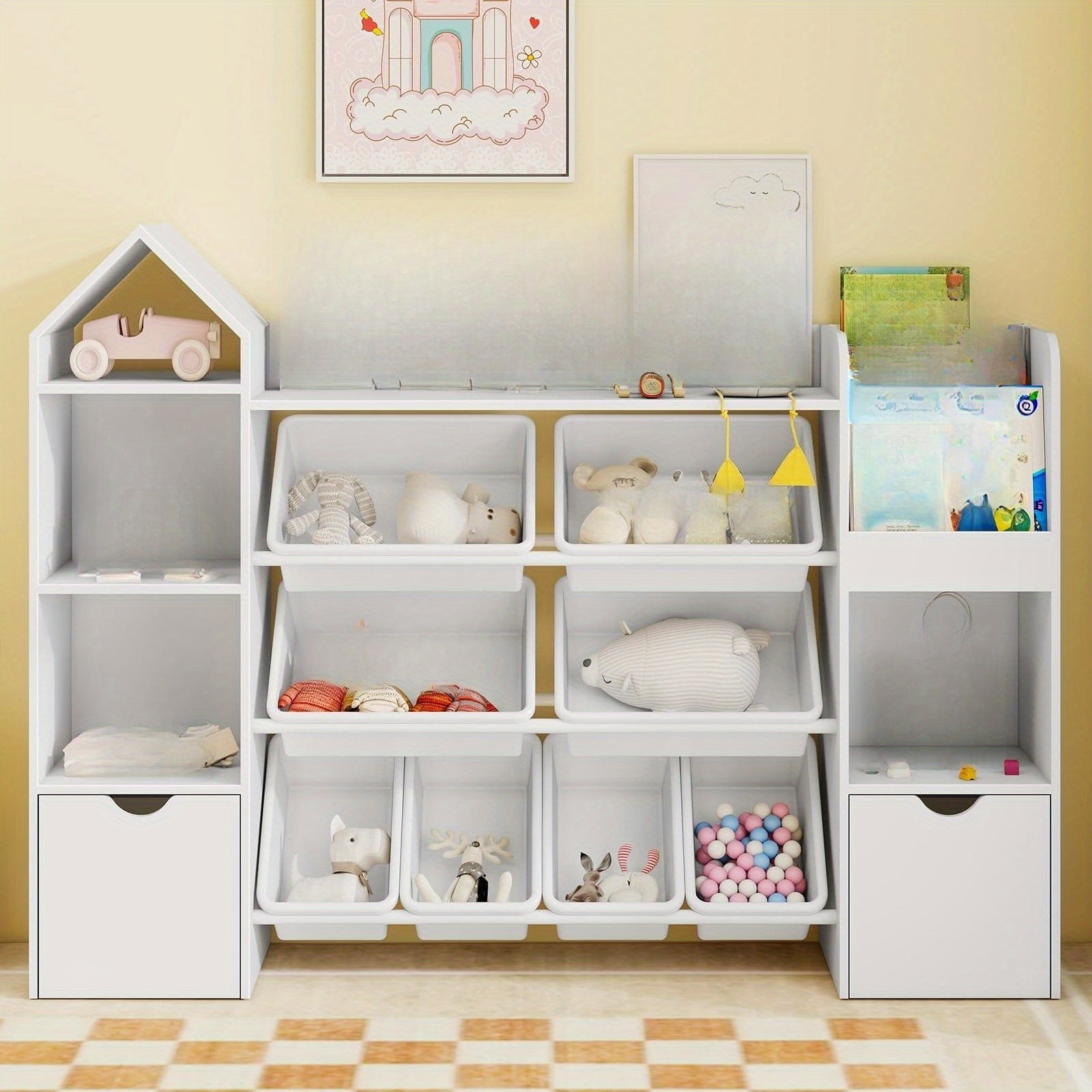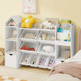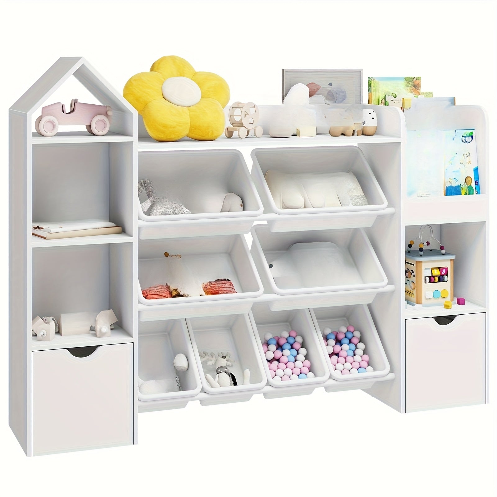 8-Bin Storage Organizer 8 Removable Bins, 4-Tier Shelf with 4 Cubbies Multifunctional Storage Organizer | Bookshelf and 2 Storage Boxes on Wheels, for Living Room, Office, Entryway, White