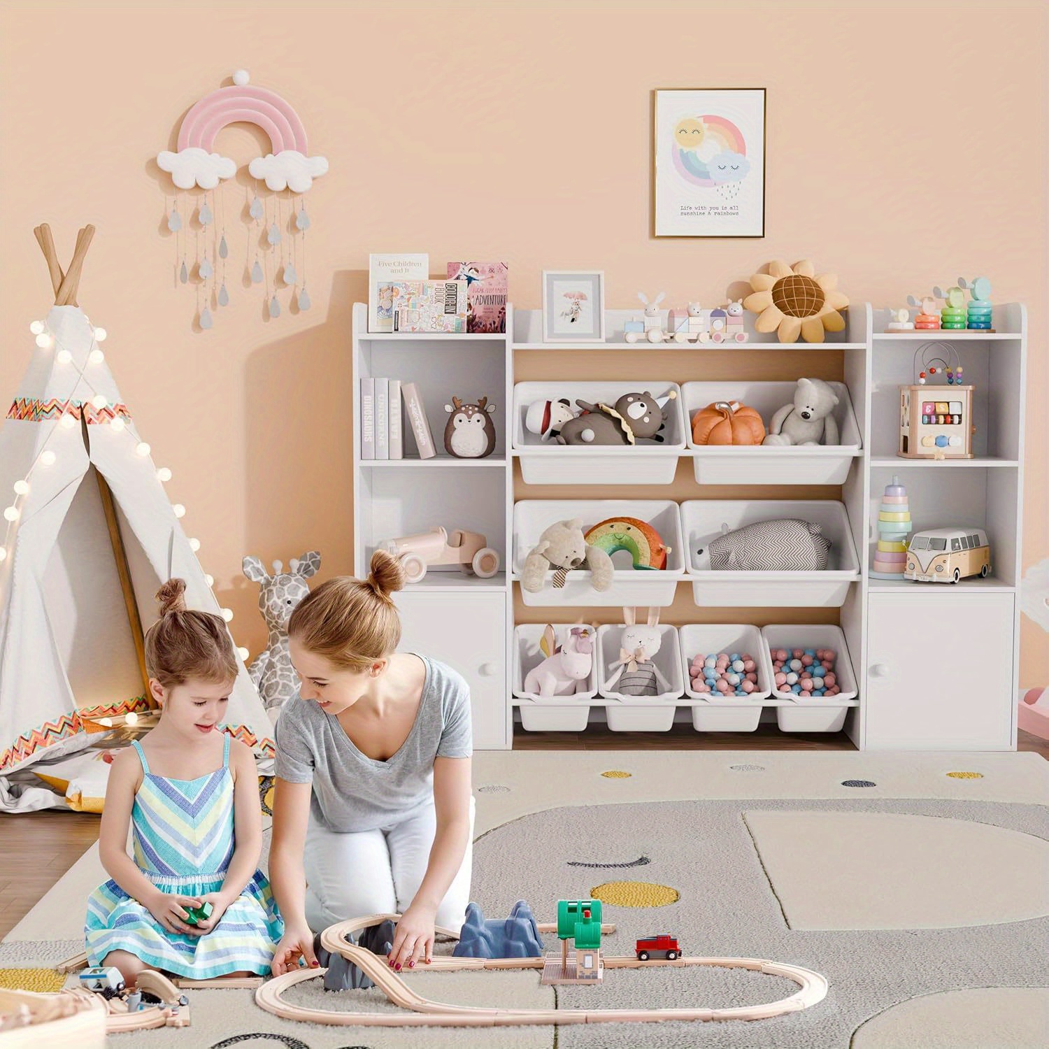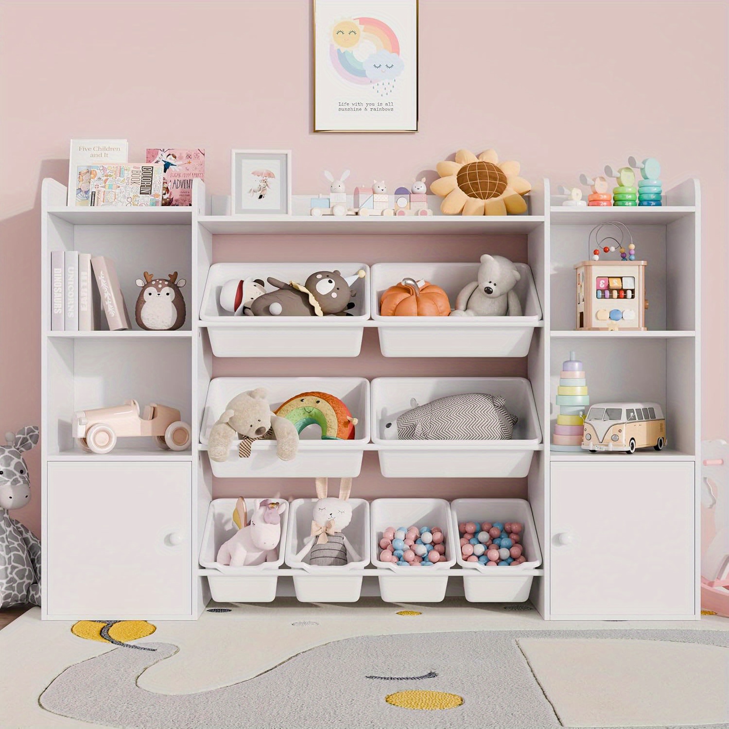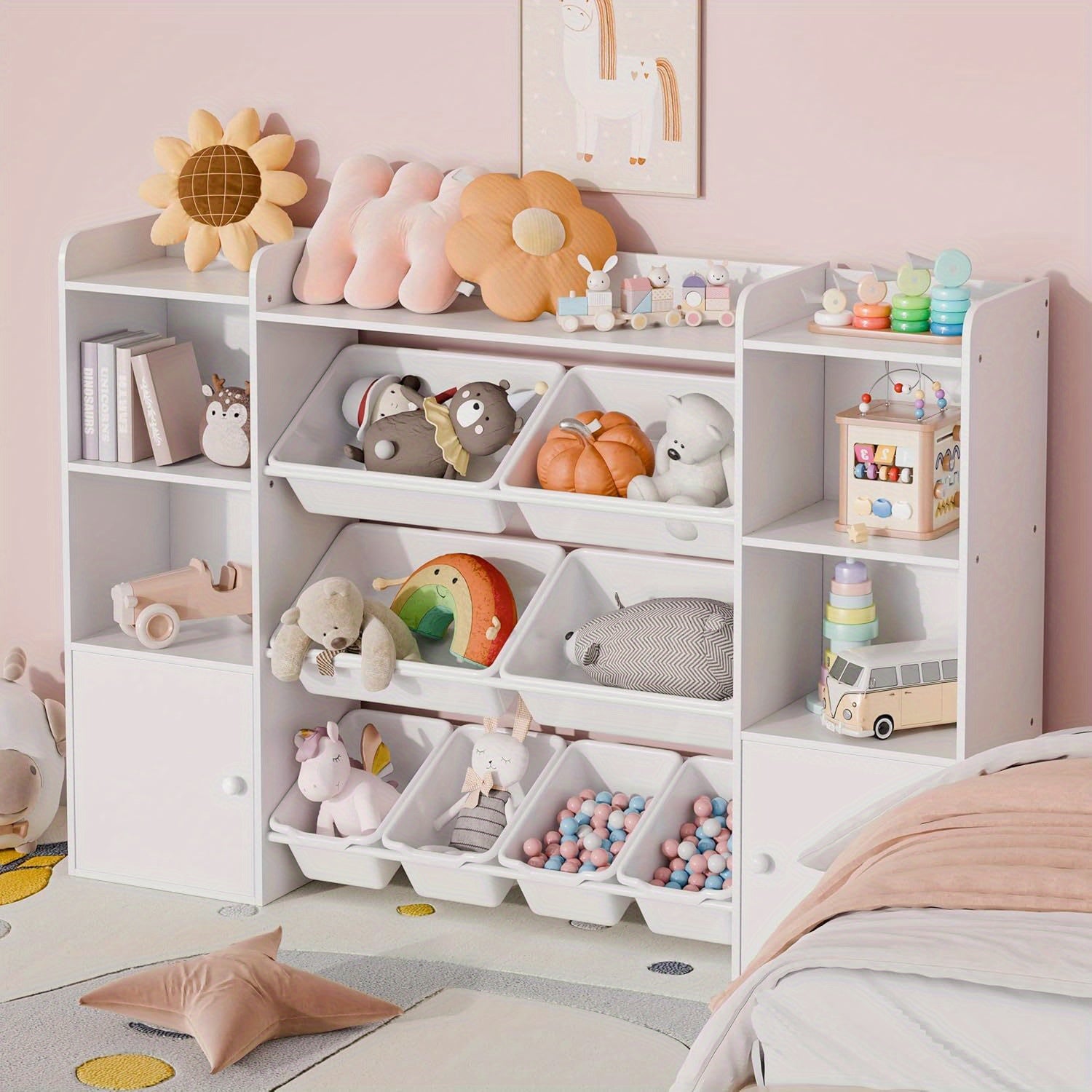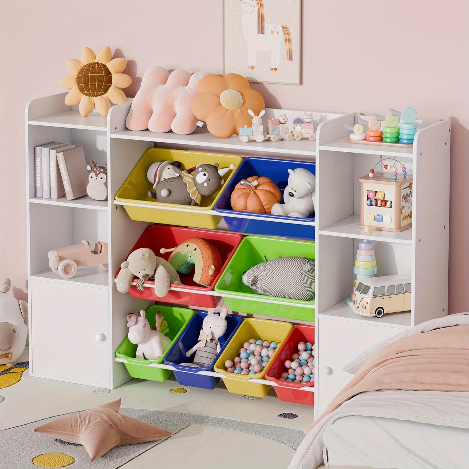 Kids Toy Storage Organizer W\u002F 8 Removable Toy Bins, 4-Tier Toy Organizers W\u002F 6 Storage Cubbies, Kids Bookshelf and Toy Storage for Playroom, Bedroom, Kids Room, Classroom